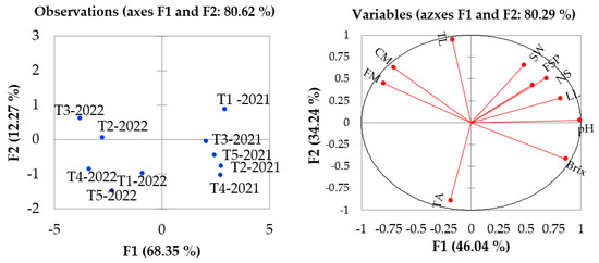 Principal component analysis (PCA) indicated that all the physico-chemical variables of ‘Precoce de Itaquera’ (Fukuhara) loquats were influenced in the first harvest, highlighting that the permanence of four flower buds per cluster (T1-2021) leads to greater fruit set and seed development, as evidenced by the positive correlation between the aforementioned variables and the first principal component. The increases in the transverse length and mass of the loquats are positioned in opposition to the characteristics of the seeds and the physico-chemical characteristics of the fruit (Figure 5).