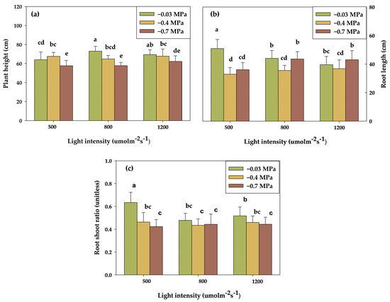 The effect of interaction between the main plot (light intensity) and subplot (water potential) on the growth characteristics for (a) total height, (b) root length, and (c) root shoot ratio. Lowercase letters above each bar represent significant differences at a level of 95%.