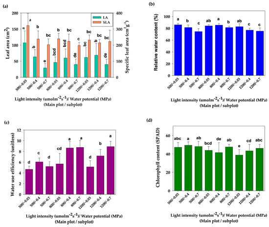 The effect of interaction between the main plot (light intensity) and subplot (water potential) on the physiological characteristics for (a) leaf area (LA) and specific leaf area (SLA), (b) relative water content, (c) water use efficiency (WUE), and (d) chlorophyll content (SPAD). Lowercase letters above each bar represent significant differences at a significance level of 95%.