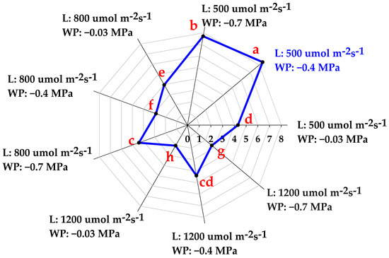 Mean total alkaloid content (TAC; measured in mgAE g−1 DW) extracted from the leaves of Mitragyna speciosa (n = 9), treated under various combinations of light intensities (L) of 500 μmol m−2s−1 (low), 800 μmol m−2s−1 (medium), and 1200 μmol m−2s−1 (high) and water potentials (WP) of −0.03 MPa, −0.4 MPa (25% of permanent wilting point), and −0.7 MPa (50% of permanent wilting point). The different lowercase red letters indicate significant differences in mean extracted amount among the various treatment combinations, with the highest accumulation highlighted in blue.
