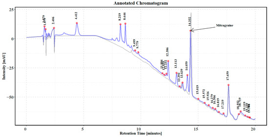 Chromatogram showing the retention times (minutes) and intensity (mAU) of the analyzed samples in blue and the mitragynine (MG) standard in gray lines. The peak annotated at 14.3 min corresponds to MG.
