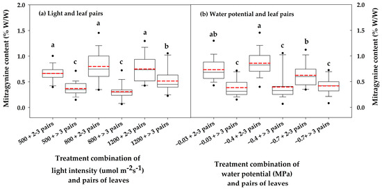 Differences in mean MG accumulation related to combinations of light intensity and leaf pairs (a) and water potential and leaf pairs (b) of kratom seedlings as determined by ANOVA (Table S3). The red dashed lines inside the boxplots indicate the mean MG levels, while the black lines indicate the median values. The different lowercase letters above the boxplots indicate significant differences in the accumulation level as indicated by ANOVA (at a level of 95%). The black filled circles above or below the boxplots indicate the respective outliers.