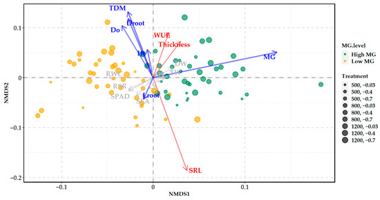 NMDS ordination plot of samples categorized by MG level, with vectors representing physiological and morphological traits. The blue vectors are the response variables (TDM is the total dry mass; Droot is the root diameter; Do is the diameter at the root collar; Ht is the plant height; and Lroot is the length of the longest root), while the ones in red are the significant traits (WUE is water use efficiency; Thickness is leaf thickness; and SRL is specific root length), with traits in gray being the non-significant traits at a level of 99%. As indicated in the legend, samples with high or low MG are plotted in green and orange circles, while the size of the circles is representative of the combined light and water potentials.