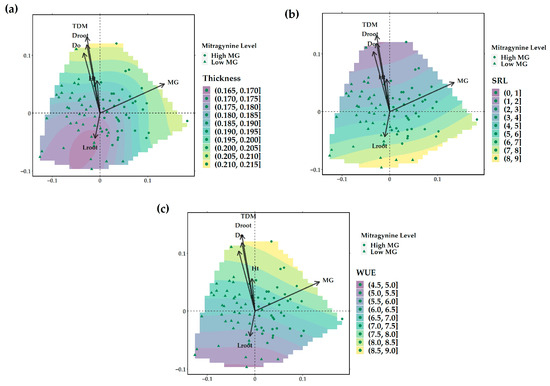 NMDS contour plot illustrating the relationship between MG levels (designated by either green circles (high) or triangles (low)) and significant growth parameters (black vectors), with contour gradients representing (a) leaf thickness, (b) specific root length (SRL), and (c) water use efficiency (WUE). The black vectors indicate the response variables (where TDM is the total dry mass; Droot is the root diameter; Do is the diameter at the root collar; Ht is the total height; and Lroot is the length of the longest root).
