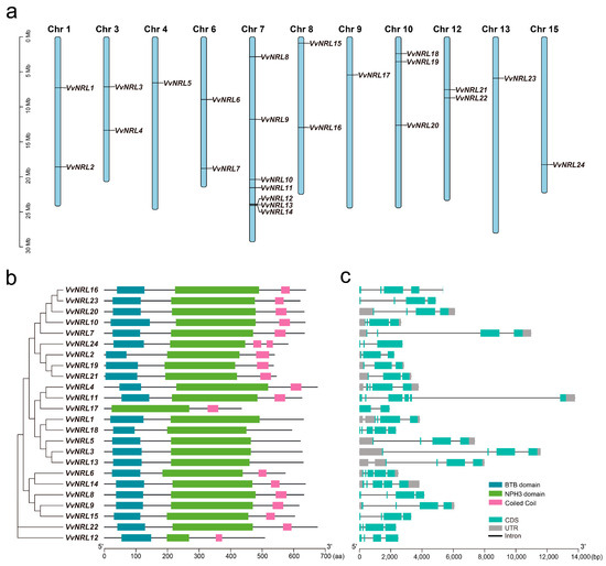 In this study, 27 candidate NRL family genes in Vitis vinifera L. were obtained using local BLAST and HMMER analysis methods (Figure S1). Subsequently, the predicted grapevine NRL family genes were screened using InterPro (https://www.ebi.ac.uk/interpro/, accessed on 17 December 2024), SMART (http://smart.embl.de/, accessed on 1 March 2025), and Pfam (http://pfam.xfam.org/, accessed on 9 January 2025). Finally, 24 rice NRL family genes were identified and named VvNRL1~VvNRL24 (Table 1). The coding region length of rice NRL family genes ranged from 1302 to 2025 bp, while their amino acid sequence length ranged from 434 to 675. Predicted protein molecular weight ranged from 48.42 to 76.31 kD, and theoretical isoelectric point ranged from 5.12 to 9.17. Subcellular localization prediction indicated that all grapevine NRL gene family members were predicted to be located on the cell membrane, with 12 NRL gene family members predicted to be located in both the nucleus and cell membrane and 2 NRL gene family members predicted to be located in the chloroplast and cell membrane. The 24 grapevine VvNRLs are mainly distributed on the 11 chromosomes of grapevine (Figure 1a). Among them, the VvNRLs on chromosome 7 have the highest distribution, with a total of seven genes located on chromosome 7 (VvNRL8, VvNRL9, VvNRL10, VvNRL11, VvNRL12, VvNRL13, and VvNRL14), while only one NRL gene is distributed on chromosomes 4, 9, 13, and 15. We then analyzed the conserved domains of the 24 NRLs. The results showed that all NRLs contain the NPH3 domain (Figure 1b). Except for VvNRL17, all other members contain the BTB/POZ domain at the N-terminus. However, compared to other members, VvNRL17 lacks two exons at the 5′ end and only contains two exon regions, while other members contain three to six exon regions (Figure 1c). In addition to the NPH3 and BTB/POZ domains, some NRL members also contain the coiled-coil domain, which is another typical feature of the NRL family. Among the 24 members, 19 members contain the coiled-coil domain at the C-terminus, with NRL24 containing two coiled-coil domains. It is worth noting that although VvNRL12 contains all the conserved domains, its NPH3 domain is significantly shorter than other members, which indicates its independent evolution compared to other members.