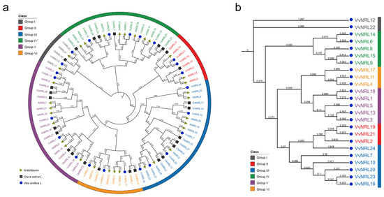 In order to further understand the functionality of the grapevine NRL gene family, NRL protein sequences from Arabidopsis (33 members) and Oryza sativa (27 members) were obtained from the online database Phytozome (https://phytozome.jgi.doe.gov/pz/portal.html, accessed on 9 January 2025) and a systematic evolutionary relationship analysis was performed (Figure 2a). The results showed a total of 84 NRLs, which could be classified into six groups (Group I~VI) consisting of 5, 8, 21, 19, 21, and 10 members, respectively. The grapevine NRL family members were evenly distributed among these six groups. Specifically, VvNRL12 and VvNRL22 were in Group I; VvNRL6, 8, 9, 14, and 15 were in Group IV; VvNRL4, 11, and 17 were in Group VI; VvNRL1, 3, 5, 13, and 18 were in Group V; VvNRL2, 19, and 21 were in Group II; and VvNRL7, 10, 16, 20, 23, and 24 were in Group III (Figure 2a,b). It is worth noting that VvNRL4 showed a close evolutionary relationship with AtNPH3 and VvNRL6 showed a close evolutionary relationship with AtRPT2, suggesting that they may have similar functionalities.