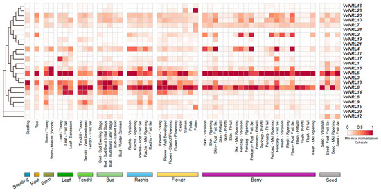 Illustration of the expression patterns of the grapevine NRL gene family in different tissues at various developmental stages. The expression data were derived from the GEO DataSets (GSE36128), and subsequently, the expression levels were normalized using min–max standardization.