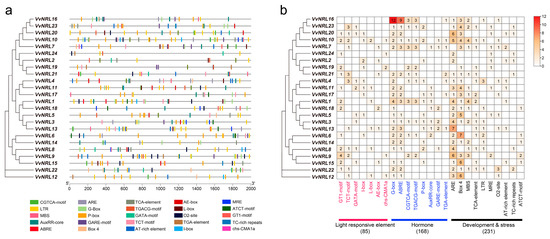 Analysis of cis-acting elements in the promoter sequences of the grapevine NRL protein family members. (a) Comparison of VvNRLs’ promoter sequences: distribution of cis-elements on the promoter regions of VvNRLs. A total of 484 cis-elements were identified. Predicted putative cis-acting elements were generated using PlantCARE, and different colored bars represent different types of cis-elements. (b) Number and percentage of cis-element occurrence in the upstream sequences of 24 VvNRLs in grapevine. Depth of red represents the number of cis-acting regulatory elements.
