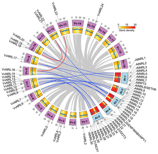 Illustration of the distribution and synteny analysis of VvNRLs and AtNRLs with respect to the chromosomes of grapevine and Arabidopsis. Synteny relationships between VvNRLs themselves, as well as between AtNRLs and VvNRLs, are depicted by connecting lines in red and blue, respectively. The syntenic relationships of other genes are shown using gray lines. Chromosome lengths are indicated to scale, and gene density is represented using a heatmap, with a window size of 100 kb. The line graph represents CG content, with a window size of 10 kb. Vv1–Vv19 corresponds to the 19 grapevine chromosomes, while At1–At5 represents the 5 Arabidopsis chromosomes.