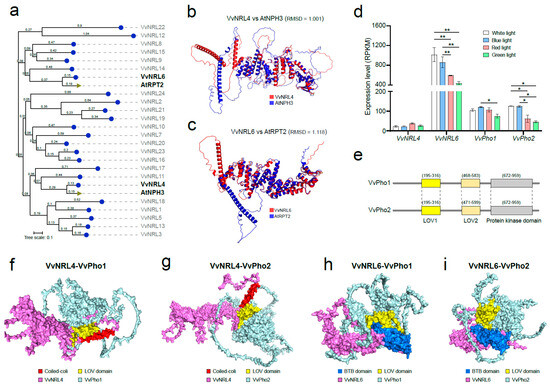 Phylogenetic relationship and structure analysis of NRL proteins from different plant species. (a) Phylogenetic tree of the VvNRL protein family (grape) and AtNPH3 and AtRPT2 (Arabidopsis). The NRL gene family was subjected to a systematic evolutionary analysis using the neighbor-joining (NJ) method and the JTT matrix-based model in MEGA 7.0. Bootstrap was set to 1000. Circles represent grape; triangles represent Arabidopsis. (b) Structural comparison of VvNRL4 (red) and AtNPH3 (blue). (c) Structural comparison of VvNRL6 (red) and AtRPT2 (blue). (d) Expression levels of VvNRL4, VvNRL6, VvPho1, and VvPho2 under different light conditions. (e) Conserved domains in VvPho1 (1004 aa) and VvPho2 (1001 aa), with LOV1 and LOV2 indicating the LOV domain. Gray dashed lines represent collinearity within the same domain. (f,g) Docking modes of VvNRL4 (violet) with VvPHO1 and VvPHO2 (wathet) proteins. The coiled-coil domain of VvNRL4 is highlighted in red, while the LOV domain of VvPHO1 and VvPHO2 is highlighted in yellow. (h,i) Docking modes of VvNRL6 (violet) with VvPHO1 and VvPHO2 (wathet) proteins. The coiled-coil domain of VvNRL6 is highlighted in red, while the LOV domain of VvPHO1 and VvPHO2 is highlighted in yellow. * and ** indicate significant differences at p < 0.05 and p < 0.01 respectively (Student’s t-test).