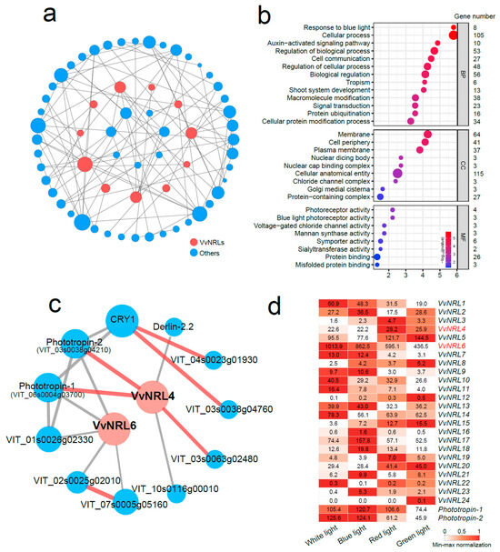 VvNRL protein–protein interaction (PPI) network and biological function annotation. (a) Network showing the interactions between VvNRLs and their co-expressed proteins. Gray lines represent minimum required interaction scores with high confidence (>0.700 and <0.900), while red lines represent minimum required interaction scores with the highest confidence (>0.900). (b) Gene Ontology (GO) enrichment analysis of the genes in the PPI network, categorized into biological process (BP), cellular component (CC), and molecular function (MF). (c) Co-expression of genes with VvNRL4 and VvNRL6. Expression levels are shown on a scale (min–max normalization, row scale). (d) Expression levels of VvNRLs, Phototropin-1, and Phototropin-2 under different light conditions. RNA-seq data from Li et al. [27]. Expression levels were normalized using the min–max method (row scale).