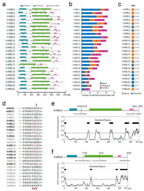 Prediction of phosphorylation sites in VvNRL proteins, and conservation of the RxS phosphorylation sites of VvNRLs. (a) Distribution of predicted phosphorylation sites (Serine/threonine kinase) in VvNRL1 to 24 using the GPS 6.0 web server with a high threshold. (b) Number of serine (S), threonine (T), and tyrosine (Y) phosphorylation sites in VvNRL proteins. (c) Types and quantities of phosphorylation sites for the AGC kinase class in VvNRL proteins. (d) Conservation of the PHOT1 phosphorylation sequence of AtNPH3, with amino acid alignment of the last 10 residues in the AtRPT2 and VvNRL protein family. The position of S744 is indicated by an arrow, and sequences containing an RxS phosphorylation motif are denoted with an asterisk. (e,f) Distribution of phosphorylation sites for the AGC kinase class and prediction of disorder regions in VvNRL4 and VvNRL6. Disorder regions were predicted using flDPnn [31]. * indicate stop codon.