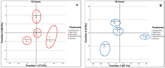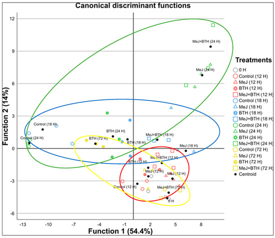- T-Resveratrol: In the first 12 h, an increase in T-resveratrol concentration was observed in all treatments (Figure 3E), with this increase being especially notable in the MeJ and MeJ + BTH samples, which reached concentrations much higher than the other groups. At the 18-h sampling, this compound continued to increase in MeJ and BTH treatments, although to a lesser extent in the latter. Conversely, a marked decrease was recorded in the MeJ + BTH-treated plants, with a slight decrease in the control group. In the 24-h sampling, T-resveratrol concentration dramatically decreased in MeJ-treated samples, while in BTH-treated samples, it also declined but less markedly. Conversely, the control and MeJ + BTH groups showed a slight increase in T-resveratrol concentration. At the end of the study, T-resveratrol concentration levelled across all samples, except in MeJ + BTH samples, which showed the lowest concentration of this compound.