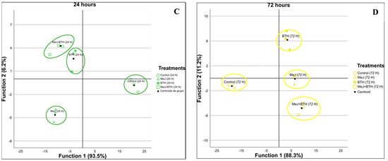 - Piceatannol: During the first 12 h, Piceatannol concentration increased in all treated plants (Figure 3D) except for the control group. At the 18-h sampling, the MeJ and MeJ + BTH groups continued to show an increase in concentration, contrasting with the control group, which continued to decline, while the MeJ + BTH group began to decrease. In the subsequent sampling (24 h), the MeJ, BTH, and MeJ + BTH samples continued to decrease in Piceatannol concentration, except for the control group, which showed a slight increase. At the end of the study, a general increase in Piceatannol concentration was observed in all samples, being more pronounced in the treated plants. Specifically, the MeJ and MeJ + BTH treatments were statistically distinguishable from the control samples.