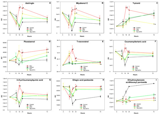 - Astringin: Figure 3A shows a general decrease in astringin concentration across all analysed samples during the first 12 h of the study. At 18 h, astringin concentration continued to decrease in the Control, BTH, and MeJ + BTH groups, except for the MeJ-treated samples, which reached their maximum concentration at this time. From 18 to 24 h, astringin concentration increased in the control, BTH, and MeJ + BTH samples, while it began to decrease in the MeJ-treated samples. After this point, the concentration of astringin declined in all samples until the end of the study (72 h). It is worth noting that MeJ-treated plants were the only ones showing a significantly higher concentration of astringin at the 18 and 24-h samplings compared to the other treatments.