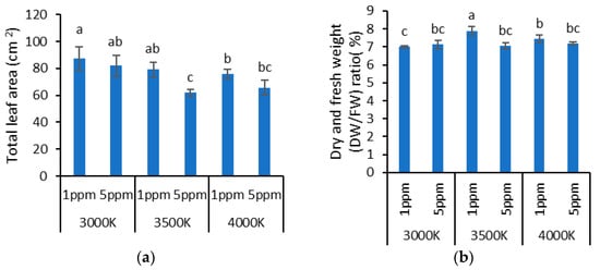 The effect of light (3000 K, 3500 K, 4000 K) and Zn doses (1 ppm, 5 ppm) in a hydroponic solution on the total lettuce leaf area and the dry (a) and fresh (b) weight ratio. The values are means ± SE (standard error). According to Tukey’s test, different letters in columns indicate significant differences at 5%.