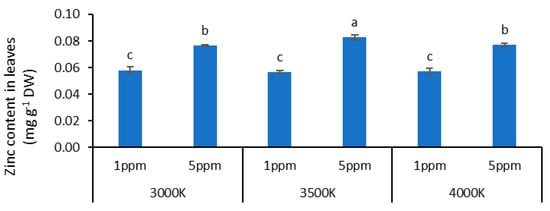 The effect of light (3000 K, 3500 K, 4000 K) and Zn doses (1 ppm, 5 ppm) in hydroponic solution on Zn content in lettuce leaves. The values are means ± SE (standard error). According to Tukey’s test, different letters in columns indicate significant differences at 5%.