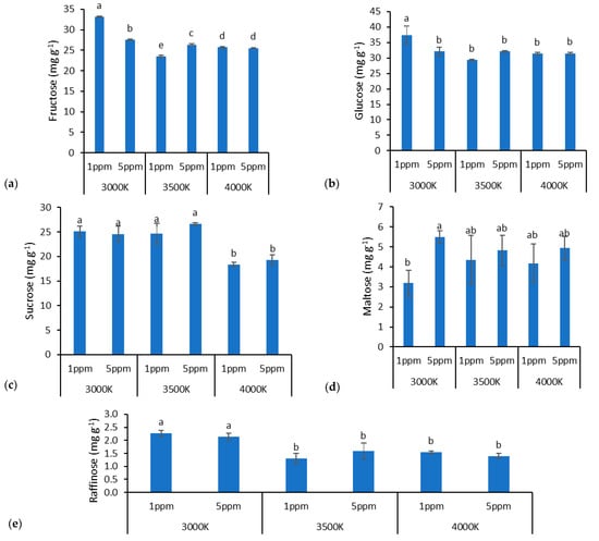 The effect of light (3000 K, 3500 K, 4000 K) and Zn doses (1 ppm, 5 ppm) in hydroponic solution on sugars ((a)—fructose, (b)—glucose, (c)—sucrose, (d)—maltose, (e)—raffinose) content in lettuce leaves. According to Tukey’s test, the values are means ± SE (standard error), and different letters indicate significant differences in each sugar content at 5%.