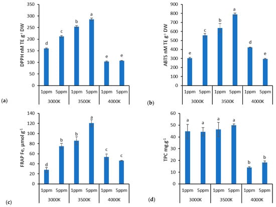 The effect of light (3000 K, 3500 K, 4000 K) and Zn doses (1 ppm, 5 ppm) in a hydroponic solution on antioxidant activity ((a)—DPPH, (b)—ABTS, (c)—FRAP) and total phenol content ((d)—TPC) in lettuce leaves. The values are means ± SE (standard error). According to Tukey’s test, different letters in columns indicate significant differences at 5%.