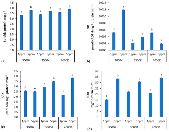 The effect of light (3000 K, 3500 K, 4000 K) and Zn doses (1 ppm, 5 ppm) in a hydroponic solution on soluble protein content of (a) antioxidant enzymes activities ((b) Glutathione reductase (GR), (c) Ascorbate peroxidase (APX), (d) Superoxide dismutase (SOD)) in lettuce leaves. The values are means ± SE (standard error). According to Tukey’s test, different letters in the columns indicate significant differences at 5%.