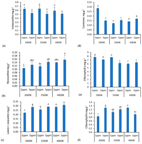 The effect of light (3000 K, 3500 K, 4000 K) and Zn doses (1 ppm, 5 ppm) in a hydroponic solution on Violaxanthin (a), Neoxanthin (b), Lutein + zeaxanthin (c), Carotenes (d), Chlorophyll a (e), Chlorophyll b (f) content in lettuce leaves. The values are means ± SE (standard error), and different letters in the columns indicate significant differences. The data were processed using analysis of variance (ANOVA), the Tukey (HSD) test at the confidence level p = 0.05.