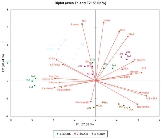 An analysis of principal components (PCA) was conducted to discuss the combined effects of lighting and Zn doses on the biochemical properties of hydroponically grown lettuces (Figure 7). The first four PCA F1–F4, had eigenvalues ranging from 8.333 to 2.293 and collectively explained 37.88% to 84.72% of the variability. F1, which accounted for 37.88% of the total variability, was primarily associated with the Zn content, fructose, glucose, maltose, total protein content, superoxide dismutase, neoxanthin, lutein, zeaxanthin, carotenes, and chlorophyll A. F2 represented 20.74% of the total variability and included sucrose, DPPH, ABTS scavenging activity, FRAP, and total phenolic compounds. F3 explained 15.68% of the variability, including raffinose, violaxanthin, and xanthophylls. F4 explained 10.42% of the variability and included glutathione reductase, ascorbate peroxidase, and chlorophyll B. Figure 1 depicts the PCA of the first two components (F1 and F2), illustrating the relationships among the variables. It can be observed that the 5 ppm Zn dose combined with 3000 K and 4000 K lighting affected various biochemical factors, including DPPH and ABTS scavenging activity and the Fe-reducing antioxidant power.