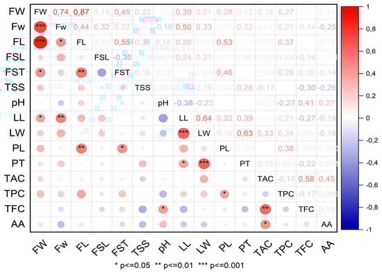 Figure 3. Pearson correlation matrix of fruit, leaf, and biochemical characteristics of mulberry genotypes (significance level p ≤ 0.05).
