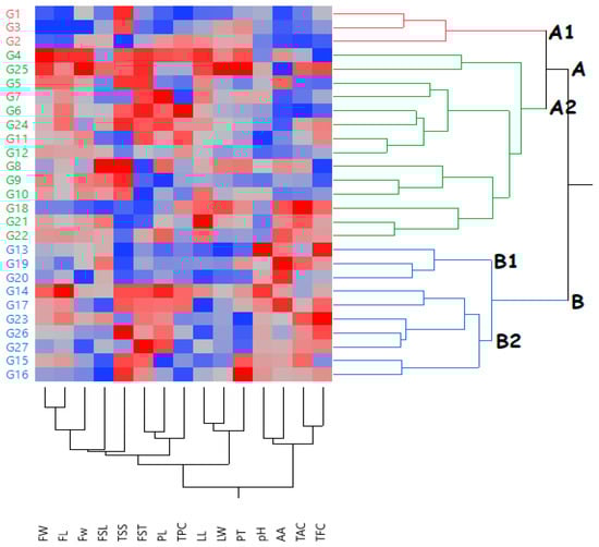 Heatmap hierarchical clustering analysis is one of the most common multivariate statistical methods; it allows the genotypes and the examined traits in the studies to be evaluated together. Heatmap hierarchical clustering analysis was performed to classify the examined hawthorn genotypes according to their morphological and biochemical traits. In the heatmap hierarchical clustering analysis, the color intensity changing from blue to red indicates the height in the values of the traits of the genotypes. As a result of heatmap analysis, the genotypes were divided into two main groups (Figure 5). Each group was again divided into two subgroups within itself. In group A, the G1, G3, and G2 genotypes constituted the A1 subgroup, while the A2 subgroup was divided into two subgroups within itself. Among the genotypes in the A1 group, the G1 and G3 genotypes had high TSS characteristics, while the G2 genotype had high TPC, PL, LL, and LW characteristics. Among the genotypes in the A2 group, the G4 and G25 genotypes had FW, FL, Fw, FST, LL, LW, and PT characteristics; the G5, G7, G6, G24, G11, G12, G8, G9, and G10 genotypes had FSL, TSS, FST, PL, and TPC characteristics; and the G18, G21, and G22 genotypes had high values in the TAC, AA, LL, and LW characteristics. Group B was divided into two subgroups. These subgroups were again divided into two subgroups. In group B, genotypes G19, G20, and G13 constituted the B1 subgroup, while G14, G15, G16, G17, G23, G26, and G27 constituted the B2 subgroup. While the genotypes in group B1 have high values in TFC, AA, and pH characteristics, the genotypes in group B2 have high values in FL, TSS, FST, PL, PT, pH, AA, and TFC characteristics.