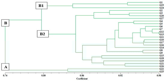 To reveal the genetic relationship between mulberry genotypes, a UPGMA dendrogram based on the ISSR primers was created (Figure 6). The similarity index of the genotypes was determined as being between 0.74 and 0.98 according to the UPGMA dendrogram. The genotypes were divided into two main groups according to the dendrogram. The G22 and G25 genotypes were included in group A with a similarity index of 0.84, while the other genotypes were included in group B. Group B was divided into two subgroups. The G1, G23, and G24 genotypes were found in the B1 group. The G12 and G13 genotypes had the highest similarity index, with a similarity index of 0.98.