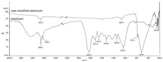 The chemical bonding structures of the particles were analyzed by FT-IR spectrophotometry (Fourier transform infrared spectroscopy). Analyses were performed in the wavelength range of 4000–400 cm−1 with a resolution of 4 cm−1. According to the results, a different spectrum due to TPP was observed in both chitosan and selenium particles (Figure 3 and Figure 4).