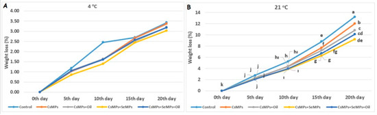 Weight loss evolution of control and coated (CsMPs: Chitosan colloidal solution; CsMPs + Oil: Chitosan colloidal solution + thyme essential oil; CsMPs + SeMPs: Chitosan colloidal solution + Selenium colloidal solution; and CsMPs + SeMPs + Oil: Chitosan colloidal solution + Selenium colloidal solution + thyme essential oil) cherry fruits over 20 days (0, 5, 10, 15, and 20 days) under two temperature conditions: 4 °C (A) and 21 °C (B). Different lowercase letters within each graph indicate significant differences between treatments and storage days, according to the LSD test (p > 0.05). If there is no statistical difference between storage days, no lettering is done.