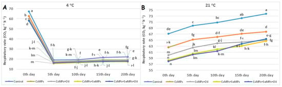Respiratory rate evolution of control and coated (CsMPs: Chitosan colloidal solution; CsMPs + Oil: Chitosan colloidal solution + thyme essential oil; CsMPs + SeMPs: Chitosan colloidal solution + Selenium colloidal solution; and CsMPs + SeMPs + Oil: Chitosan colloidal solution + Selenium colloidal solution + thyme essential oil) cherry fruits over 20 days (0, 5, 10, 15, and 20 days) under two temperature conditions: 4 °C (A) and 21 °C (B). Different lowercase letters within each graph indicate significant differences between treatments and storage days, according to the LSD test (p > 0.05).