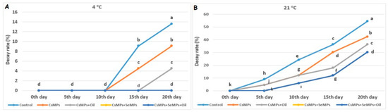 Decay rate evolution of control and coated (CsMPs: Chitosan colloidal solution; CsMPs + Oil: Chitosan colloidal solution + thyme essential oil; CsMPs + SeMPs: Chitosan colloidal solution + Selenium colloidal solution; CsMPs + SeMPs + Oil: Chitosan colloidal solution + Selenium colloidal solution + thyme essential oil) cherry fruits over 20 days (0, 5, 10, 15, and 20 days) under two temperature conditions: 4 °C (A) and 21 °C (B). Different lowercase letters within each graph indicate significant differences between treatments and storage days, according to the LSD test (p > 0.05).
