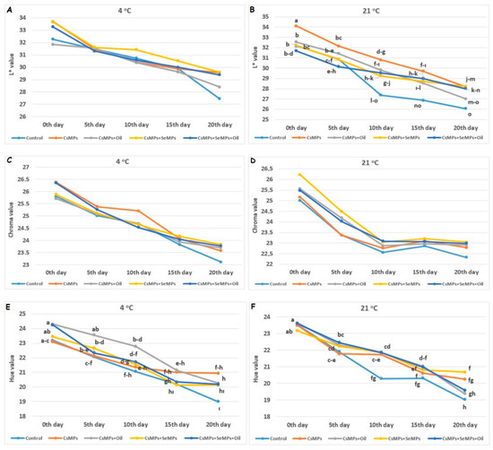 Color characteristics evolution of control and coated (CsMPs: Chitosan colloidal solution; CsMPs + Oil: Chitosan colloidal solution + thyme essential oil; CsMPs + SeMPs: Chitosan colloidal solution + Selenium colloidal solution; CsMPs + SeMPs + Oil: Chitosan colloidal solution + Selenium colloidal solution + thyme essential oil) cherry fruits over 20 days (0, 5, 10, 15, and 20 days) under two temperature conditions: L* value at 4 °C (A), L* value at 21 °C (B), Chroma value at 4 °C (C), Chroma value at 21 °C (D), Hue value at 4 °C (E), and Hue value at 21 °C (F). Different lowercase letters within each graph indicate significant differences between treatments and storage days, according to the LSD test (p > 0.05). If there is no statistical difference between storage days, no letters are included.