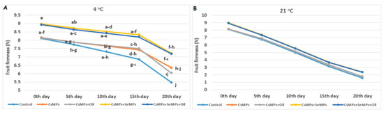 Fruit firmness evolution of control and coated (CsMPs: Chitosan colloidal solution; CsMPs + Oil: Chitosan colloidal solution + thyme essential oil; CsMPs + SeMPs: Chitosan colloidal solution + Selenium colloidal solution; CsMPs + SeMPs + Oil: Chitosan colloidal solution + Selenium colloidal solution + thyme essential oil) cherry fruits over 20 days (0, 5, 10, 15, and 20 days) under two temperature conditions: 4 °C (A) and 21 °C (B) Different lowercase letters within each graph indicate significant differences between treatments and storage days, according to the LSD test (p > 0.05). If there is no statistical difference between storage days, no letters are included.