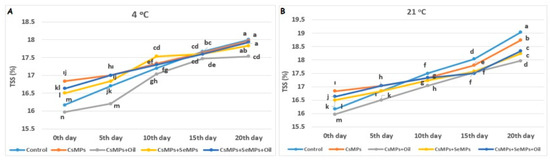 Evolution of TSS amount in control and coated (CsMPs: Chitosan colloidal solution; CsMPs + Oil: Chitosan colloidal solution + thyme essential oil; CsMPs + SeMPs: Chitosan colloidal solution + Selenium colloidal solution; CsMPs + SeMPs + Oil: Chitosan colloidal solution + Selenium colloidal solution + thyme essential oil) cherry fruits over 20 days (0, 5, 10, 15, and 20 days) under two temperature conditions: 4 °C (A) and 21 °C (B) Different lowercase letters within each graph indicate significant differences between treatments and storage days, according to the LSD test (p > 0.05).