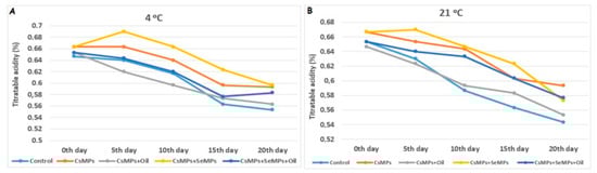 Titratable acidity content evolution of control and coated (CsMPs: Chitosan colloidal solution; CsMPs + Oil: Chitosan colloidal solution + thyme essential oil; CsMPs + SeMPs: Chitosan colloidal solution + Selenium colloidal solution; CsMPs + SeMPs + Oil: Chitosan colloidal solution + Selenium colloidal solution + thyme essential oil) cherry fruits over 20 days (0, 5, 10, 15, and 20 days) under two temperature conditions: 4 °C (A) and 21 °C (B).