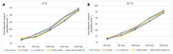 Total phenolic content evolution of control and coated (CsMPs: Chitosan colloidal solution; CsMPs + Oil: Chitosan colloidal solution + thyme essential oil; CsMPs + SeMPs: Chitosan colloidal solution + Selenium colloidal solution; CsMPs + SeMPs + Oil: Chitosan colloidal solution + Selenium colloidal solution + thyme essential oil) cherry fruits over 20 days (0, 5, 10, 15, and 20 days) under two temperature conditions: 4 °C (A) and 21 °C (B).
