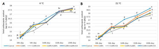 Total anthocyanin content evolution of control and coated (CsMPs: Chitosan colloidal solution; CsMPs + Oil: Chitosan colloidal solution + thyme essential oil; CsMPs + SeMPs: Chitosan colloidal solution + Selenium colloidal solution; CsMPs + SeMPs + Oil: Chitosan colloidal solution + Selenium colloidal solution + thyme essential oil) cherry fruits over 20 days (0, 5, 10, 15, and 20 days) under two temperature conditions: 4 °C (A) and 21 °C (B) Different lowercase letters within each graph indicate significant differences between treatments and storage days, according to the LSD test (p > 0.05).
