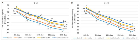 Total antioxidant capacity evolution of control and coated (CsMPs: Chitosan colloidal solution; CsMPs + Oil: Chitosan colloidal solution + thyme essential oil; CsMPs + SeMPs: Chitosan colloidal solution + Selenium colloidal solution; CsMPs + SeMPs + Oil: Chitosan colloidal solution + Selenium colloidal solution + thyme essential oil) cherry fruits over 20 days (0, 5, 10, 15, and 20 days) under two temperature conditions: 4 °C (A) and 21 °C (B) Different lowercase letters within each graph indicate significant differences between treatments and storage days, according to the LSD test (p > 0.05).
