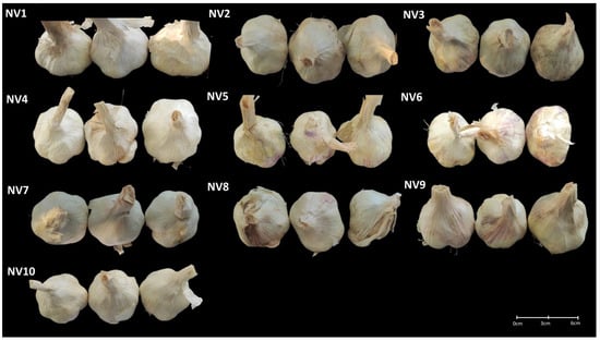Bulbs from the 10 different NV sampling sites (NV1–NV10) of the local garlic population in Evros, Northern Greece.