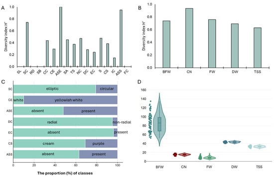 Genetic diversity and variation analysis of the NV garlic population. (A) Bar chart of the diversity index (H′) for qualitative morphological descriptors; (B) Bar chart of the diversity index (H′) for quantitative morphological traits; (C) The proportion of classes for selected morphological descriptors exerting the highest diversity among the population; (D) Violin plots of the population variation regarding quantitative morphological traits. BFW, FW, and DW are expressed in gr, while TSS is in oBrix. SL: bulb shape in longitudinal section; SC: bulb shape in cross-section; RD: position of root disc; SB: shape of base; CC: compactness of cloves; CE: color of dry external scales; ASE: anthocyanin stripes on external scales; SA: skin adherence of external scales; TS: thickness of external scales; NC: number of cloves; DC: distribution of cloves; EC: presence of external cloves; S: clove size; CS: clove color; IC: intensity of color scales; ASS: anthocyanin stripes on scale; FC: flesh color; BFW: total bulb weight; FW: fresh weight of cloves in a bulb; DW: dry weight of cloves in a bulb; CN: average number of cloves per bulb; TSS: total soluble solids (oBrix).