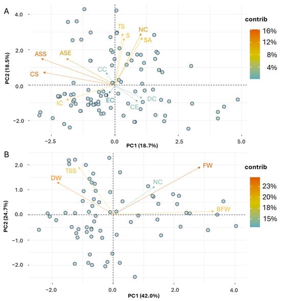 PCA biplot graph representing the NV garlic population in two main principal components for the morphological traits ((A) qualitative; (B) quantitative). The vector’s direction and length indicate the traits’ contribution to the first two components in the PCA. The transparency of the trait vectors represents the contribution to the variance in the dataset, ranging from 4% (lightest) to 16% (darkest) for the qualitative data, and from 15% to 23% for the quantitative data.