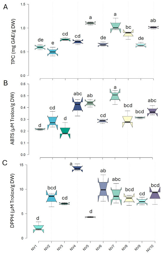 Total phenolic content (TPC) (A) and ABTS (B) and DPPH (C) antioxidant capacities of the cloves of the NV garlic population originating from the ten sampling areas (NV1–NV10). Data represent mean values of three biological replicates and two technical replications ± SD. Different letters indicate significant differences based on Tukey’s HSD test (p < 0.05).