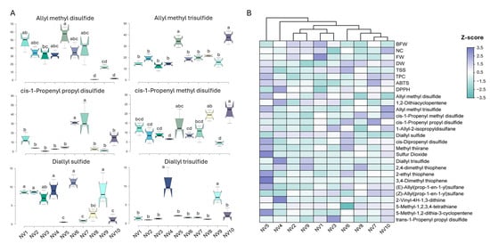 (A) The content of selected organosulfur compounds, expressed as μg 100 g−1 FW, quantified in the bulbs of the NV population originating from ten sampling sites (NV1–NV10). Data represent the mean values of three biological replicates ± SD. Different letters indicate significant differences based on Tukey’s HSD test (p < 0.05); (B) Heatmap performed on quantitative traits, TPC, and antioxidant activities (ABTS and DPPH) measured in the bulbs of the NV population from the ten sampling sites (NV1–NV10). Each cell represents the z-score normalized value of each trait. The clustering pattern of the NV population was performed using Ward’s method and Euclidean distance.