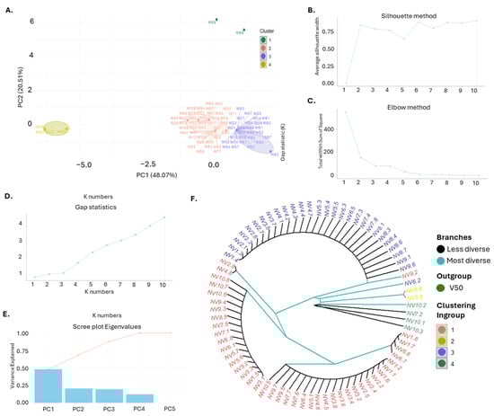Genetic Diversity and Population Structure Analysis. (A) Principal Component Analysis (PCA) of the NV garlic population originating from the ten sampling sites (NV1–NV10), as described in Supplementary Table S1. Each point represents an individual sample, color-coded by cluster (Cluster 1: salmon, Cluster 2: yellow, Cluster 3: blue, Cluster 4: green). Ellipses indicate the boundaries of each cluster; (B) Optimal number of clusters determined by the Silhouette method, (C) Optimal number of clusters determined by the Elbow method, (D) Optimal number of clusters determined by Gap Statistics; (E) Scree plot of eigenvalues showing the percentage of variance explained by each principal component; (F) UPGMA rooted dendrogram illustrating the genetic relationships among the garlic genotypes. The dendrogram is rooted using the outgroup NV7.2. Branches are color-coded to indicate diversity (less diverse branches in light blue and more diverse branches in black), with clustering consistent with PCA results.