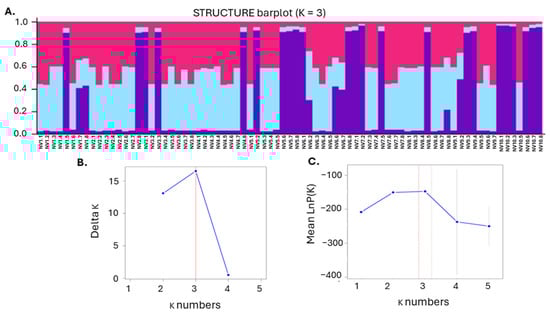 Genetic structure and optimal cluster determination. (A) STRUCTURE bar plot for K = 3, showing the assignment of individuals to four genetic clusters. Each bar represents an individual sample, with different colors indicating the proportion of ancestry from each of the four clusters; (B) Delta K values for each cluster number (K), indicating that the optimal number of clusters based on the highest peak is at K = 3; (C) Mean log probability of the data for varying numbers of clusters (K), with error bars representing one standard deviation, highlighting that K = 3 provides the best fit according to the peak of the curve.