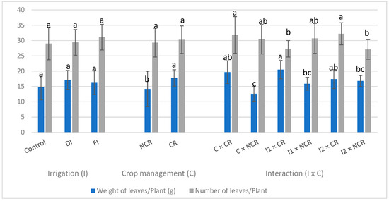 The results regarding the effects of irrigation treatments and crop management on growth parameters of C. spinosum L. are presented in Figure 2. Deficit irrigation (DI) achieved the highest weight of leaves/plant (18.4 g) followed by full irrigation (FI) (17.2 g) and the control treatment (C; rain-fed plants) (16.1 g), while the highest number of leaves/plants was recorded for the control treatment (31.1 g), followed by FI (29.4 g) and DI (29.0 g) treatments without any significant differences among the treatments. On the other hand, crop rotation had a beneficial effect on the weight of leaves/plant (CR; 19.2 g), while no significant differences were recorded for the number of leaves/plant between crop rotation and the control treatment (no rotation implemented). The interaction of the tested factors showed that deficit irrigation and crop rotation resulted in the highest weight of leaves (20.5 g) being significantly different from all the treatments where no rotations were applied, whereas the lowest overall weight of leaves was recorded for the rain-fed plants combined with no rotation (12.6 g). On the other hand, the highest number of leaves was recorded for fully irrigated plants subjected to crop rotation (32.2), whereas the lowest values were recorded for DI × CR and FI × NCR treatments (27.3 and 27.1, respectively).