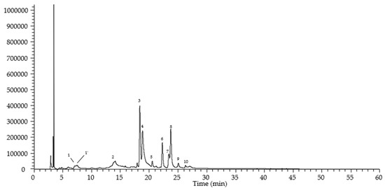 HPLC spectral phenolic profile of hydroethanolic extracts of C. spinosum leaves recorded at 370 nm. See Table 8 for tentative identification of detected peaks (peak 1–10).