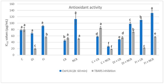 Antioxidant activity of C. spinosum L. plants in relation to irrigation and crop management (mean ± SD), determined with OxHLIA and TBARS assays. The results are expressed as IC50 values (μg/mL). Different Latin letters above bars of the same color and for the same factor or their interaction are significantly different according to Duncan’s Multiple Range test (DMRT) at p = 0.05. DI: deficit irrigation; FI: full irrigation; NCR: no crop rotation; CR: crop rotation.